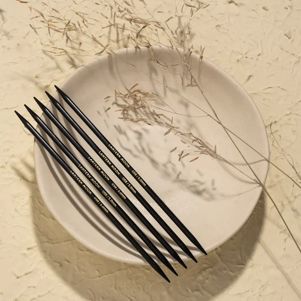 Lantern Moon double pointed needles are made of ebony. The liquid silk finish is warm and easy on the hand and ensures a smooth, no-snag stitch glide. The transition from one double point needle to the next is smoothly made thanks to the even surface of the needles and the perfectly shaped tips that work well with every type of yarn.