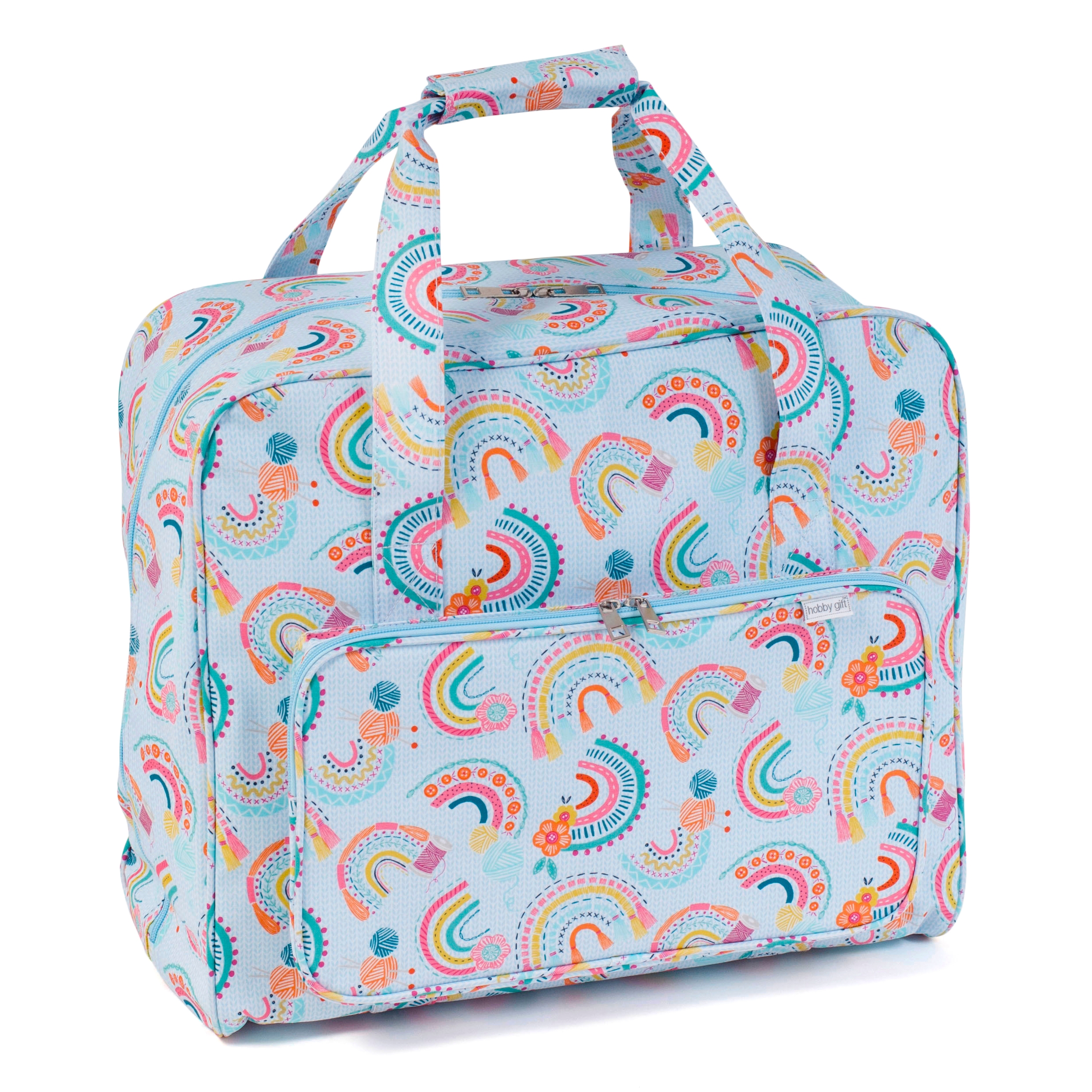 Rainbow sewing machine bag made from matt PVC-coated cotton. Durable and strong. Front pocket. Reinforced hook & loop handle strap. Can be used for storage, to keep sewing machine clean and protected. Useful for transportation. Wipe clean. Item size: (d/w/h) 20 x 44 x 38cm.Rainbow Sewing Machine Bag is made from strong materials and with pocket to carry all those additional bits and pieces.